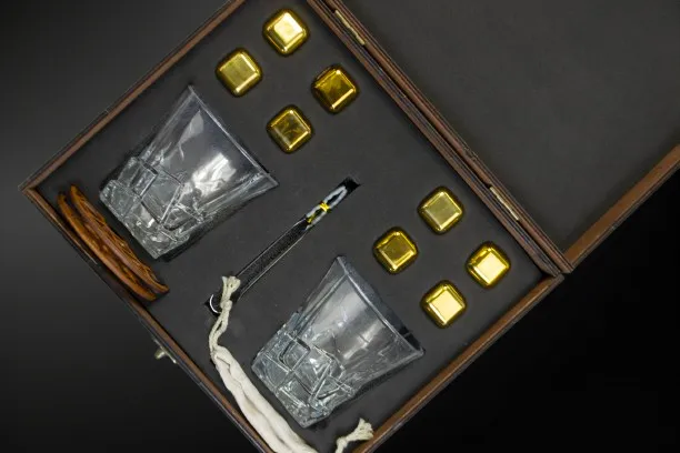 Коробка, стакани, кубики, щипці, мішечок для зберігання, підстаканники.