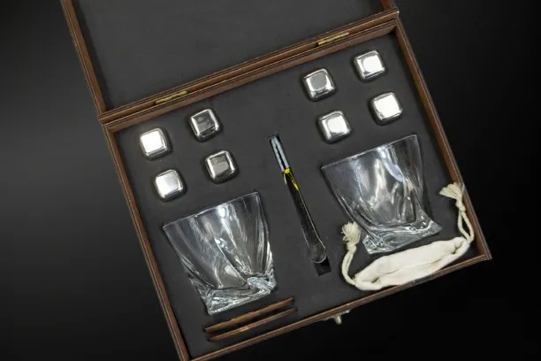 Коробка, стакани, кубики, щипці, мішечок для зберігання, підстаканники.